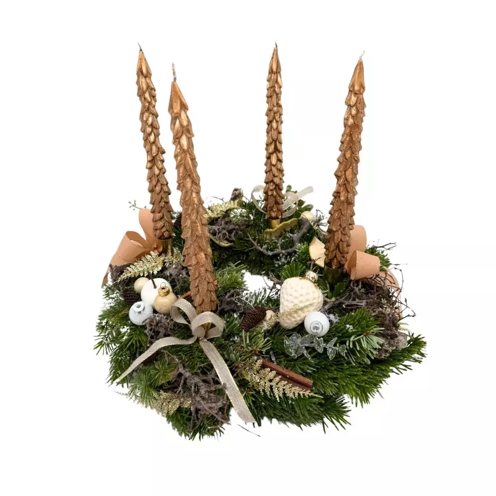 A wreath that evokes elegant, hushed and luminous Christmases. Its delicate, refined golden hues give it a precious, almost fairytale look.